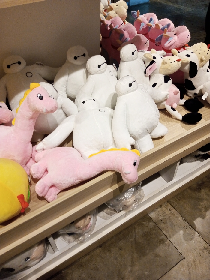 The image displays a retail merchandise arrangement of numerous plush toys on a multi-level shelving unit within a commercial establishment. The upper and middle shelves are densely populated with a variety of stuffed animals. Dominating the arrangement are numerous white, rotund, humanoid-shaped plush figures, resembling Baymax characters, approximately two dozen of which are visible in various upright and reclining positions. Prominently featured in the foreground are two pink, long-necked dinosaur-like plush toys; one stands upright on the left, and another lies horizontally across the front edge of the middle shelf. Other plush subjects include various pink animal figures, possibly pigs or hippos, and multiple cream-colored and black-and-white spotted cow-like figures, primarily visible in the background and on the right side. A partial view of a yellow, spherical plush item is visible on the far left foreground. The shelving unit consists of light-colored wooden planks supported by white uprights, with white open compartments visible underneath the main display surface, some containing smaller plush items encased in clear plastic bags. The floor visible beneath the shelving unit is a dark, mottled concrete or tiled surface. This scene is located within a commercial space in Tân Kỳ Commune, Vietnam.