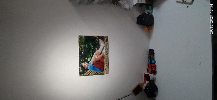 The image depicts an interior scene in the city of Rukn ad-Din Municipality, Syria. A light-colored wall, illuminated by a visible light source creating a bright spot, displays a framed picture. The picture shows a young male subject, possibly a child or adolescent, seated outdoors on a wooden structure amidst green foliage, wearing a blue shirt, red shorts, white socks, and white shoes. Below the picture, a light-colored flat surface, likely a desk or table, holds various items. From left to right, these include a black object (partially visible), a wooden hairbrush, a white cup with black markings, a row of seven toy cars of different colors, an orange stacked decorative object, a black portable speaker, and a white mug with green markings. The far right edge of the image reveals a patterned fabric or wallpaper. A digital timestamp "29/10/2025 13:34" is present in the lower right corner.