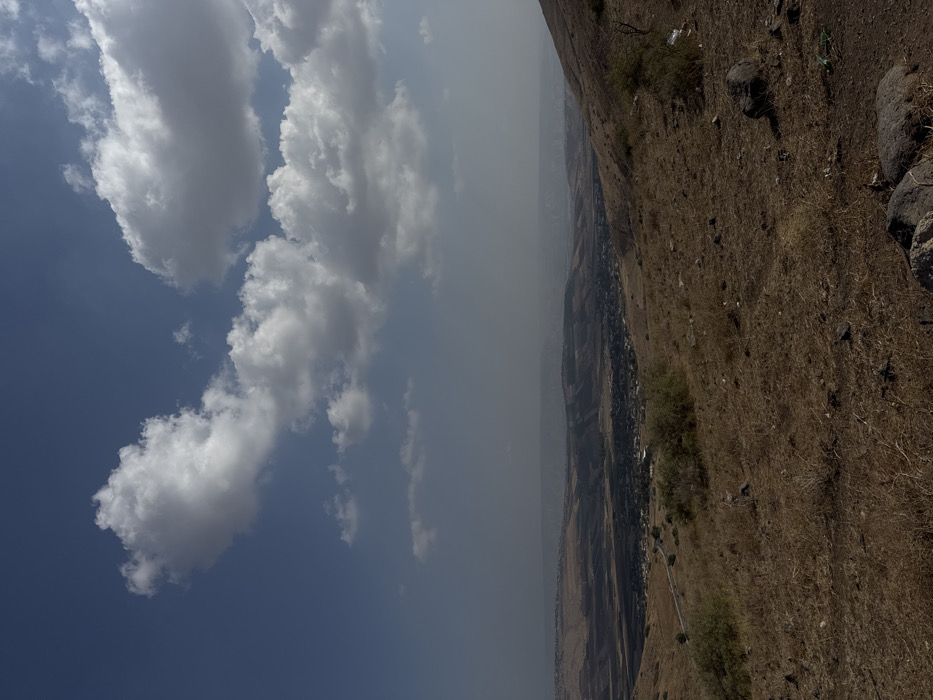 The image displays an expansive, elevated landscape view within the Galil Tachton Regional Council, Israel. The upper portion of the frame features a blue sky dotted with scattered cumulus clouds, presenting varied shades of white and grey. The foreground consists of a sloping, arid hillside covered predominantly with parched golden-brown and light brown grasses, dry earth, and scattered dark grey rocks. Sparse, low-lying green-brown shrubs are visible across this dry terrain. No individuals, animals, or active subjects are present. In the midground, the land descends into a wide valley. A narrow, dark-colored road is visible winding through the mid-left section of the landscape. A compact settlement or community, characterized by clusters of dark-roofed structures, is situated within the valley. The background shows successive layers of distant mountains and hills receding into a pale, bluish atmospheric haze, extending to the horizon.