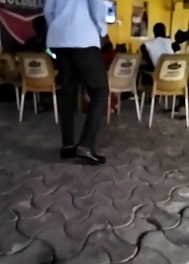 interior of an open-air bar or restaurant. There are several people seated at tables with plastic chairs, some facing away from the camera. A man in a light blue long-sleeved shirt and dark pants stands in the foreground, facing away from the camera, looking at his phone. Another man in a white shirt stands near the bar, fiddling with something. There is a "GOLDBERG" beer advertisement on the wall. A ceiling fan is visible. The floor is made of patterned grey tiles. The video is slightly blurry and shaky. There is music playing in the background.