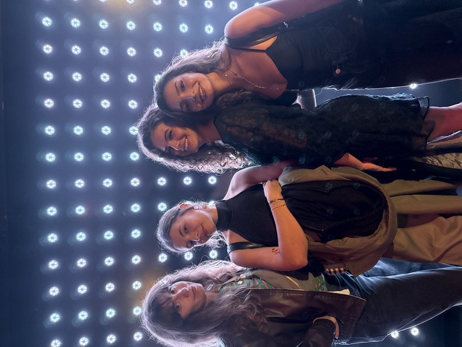 Four young adult females are depicted standing in a line, posing and smiling, against a backdrop of a grid-patterned wall featuring numerous uniformly illuminated circular white lights