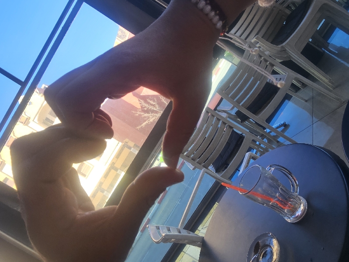 The image captures a first-person perspective from inside a building, likely a cafe or restaurant, overlooking a street or outdoor area in Azrou, Morocco. In the foreground, two human hands are positioned to create a heart shape, framing the view through a large window. The index finger of the left hand displays green nail polish. The right wrist wears a multi-strand beaded bracelet with white and dark beads. On a dark, round table in the lower left, a transparent glass mug with a handle contains an orange plastic straw and appears mostly empty. Next to the mug, a clear glass ashtray with a small amount of residue is visible. Through the window, several white plastic chairs are arranged, with some stacked in the background. Beyond the chairs, a multi-story building with a terra cotta colored facade and white window frames is partially visible under a clear, bright blue sky. Bare tree branches are also discernible against the building. The scene is illuminated by strong daylight.