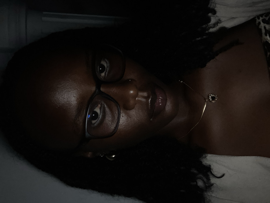 A woman with dark skin and glasses lies on her side, looking at the viewer