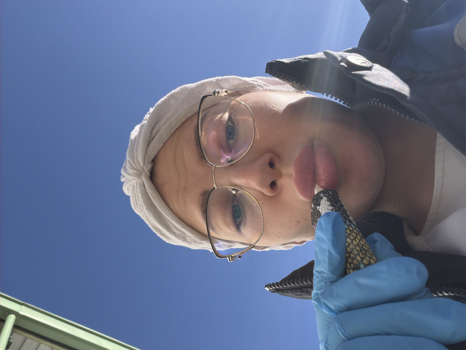 A close-up, upward-angled shot in Nova Zagora, Bulgaria, depicts a single female individual outdoors under a clear blue sky. The subject wears a light-colored, textured head wrap and gold-rimmed eyeglasses. Her lips are slightly puckered, and her left hand, covered by a light blue disposable glove, holds a cylindrical object. This object, approximately 8-10 cm in length, features a dark, patterned body resembling scales or mesh, with a lighter-colored, possibly soft tip inserted into the subject's mouth. She is wearing a dark zipped jacket over a white garment. A partial green structural element is visible in the upper left corner against the bright, sunlit blue sky.