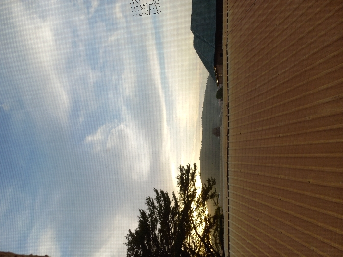 The image presents an outdoor scene observed through a fine mesh screen, likely a window screen, situated in Nyanya, Nigeria. The foreground is dominated by a reddish-brown corrugated metal roof, spanning the lower half of the frame. The corrugations run vertically, and small dark fasteners are visible along the ridges of the roof panels. Above the roof, the midground reveals a landscape under a partly cloudy sky, indicative of either sunrise or sunset. To the left, a large tree is silhouetted against the bright, diffused light, its dense foliage and branch structure visible. Centrally, rolling hills or low mountains are present, displaying faint topographical textures and some distant vegetation, partially obscured by atmospheric haze. To the right, the dark green, sloped roof and an upper wall section of a building are observable. The background consists of a light blue sky with scattered white, wispy clouds. A dark, lattice-like structure, possibly an antenna or communication tower, is partially visible along the far upper right edge of the frame. No individuals, specific actions, or interactions are depicted within the scene.
