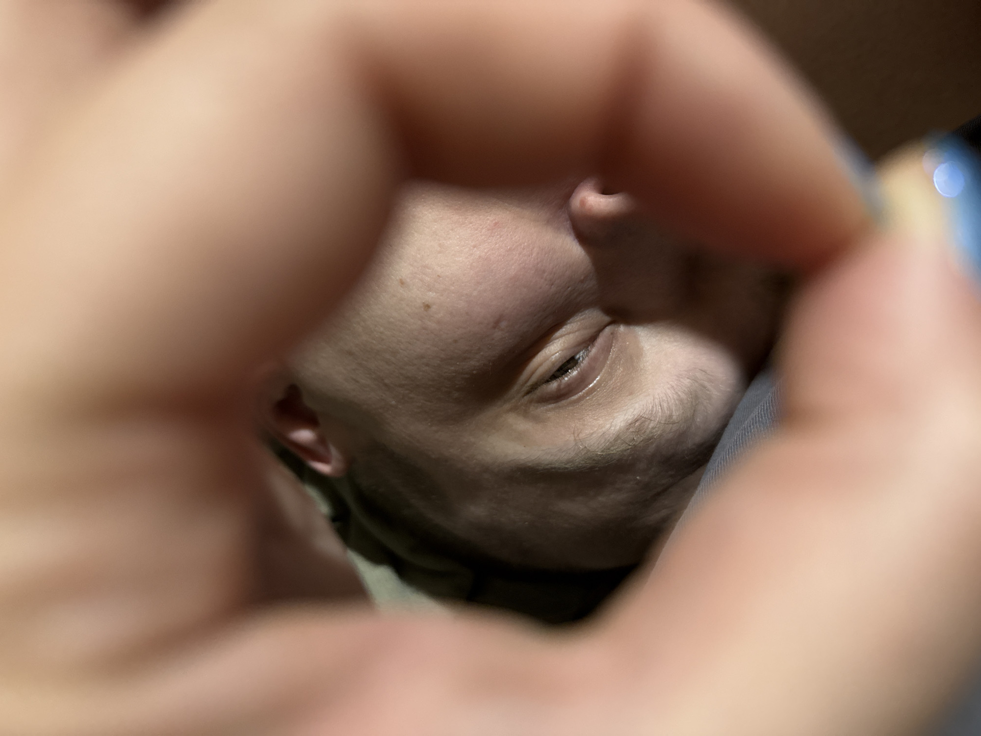 A close-up shot focuses on a person's face, specifically their eye, nose, and cheek. The face is framed by a blurred circular shape created by fingers. The skin tone is fair. Visible features include moles, and short facial hair. The environment is indistinct. There is no information to determine if the location is Dmitrov, Russia.