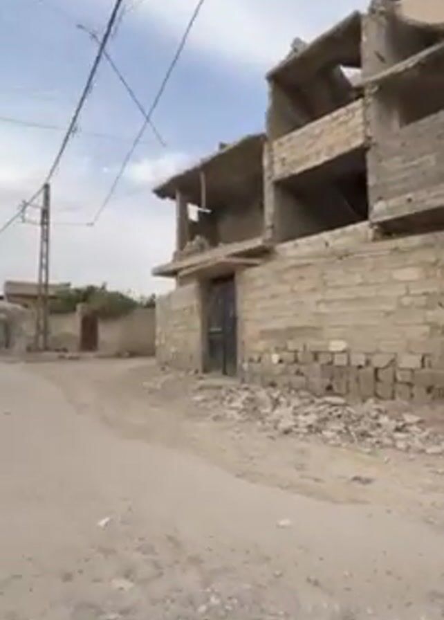 A vehicle drives along a dirt road past buildings. The buildings are mostly made of concrete block and appear weathered or partially destroyed. Power lines run overhead. The video is taken from inside the vehicle. There are no people visible. The environment appears dusty and dry.