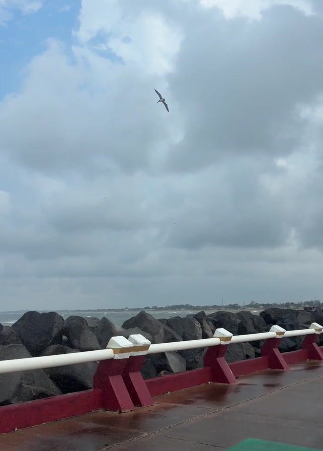 wet, painted walkway beside a rocky breakwater, with birds flying in a cloudy sky. The walkway has a red and white barrier on the seaward side. The sky is mostly overcast, but there are patches of blue peeking through. The ocean is visible beyond the breakwater.