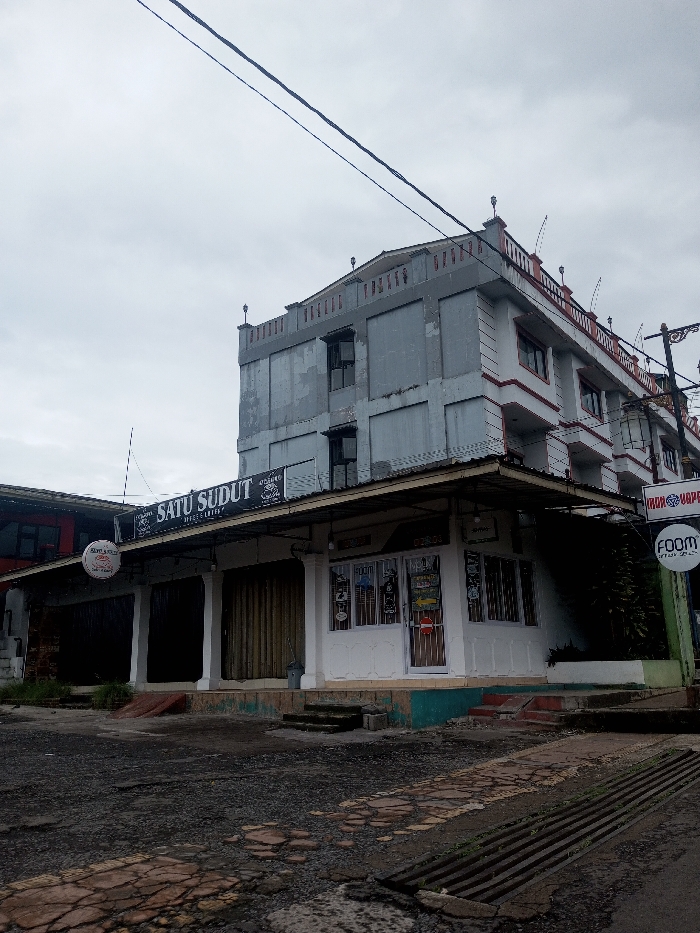 The scene depicts a street view in Ariyalai, Sri Lanka, under an overcast sky. No individuals are present. The central feature is a multi-story commercial and residential building complex. The left portion of the building is a three-story structure with a gray, weathered facade, featuring multiple rectangular windows that appear boarded or covered on the upper two floors. The ground level of this section, beneath an extended awning, comprises three closed storefronts with corrugated metal roller shutters. Above these, a black sign with white lettering reads "Satu Sudut," accompanied by smaller text referencing "Hotel" and "Coffee & Eatery." A circular white sign is affixed to the left of the main "Satu Sudut" sign. Immediately to the right of the closed units, beneath the same awning, is an operational storefront with a white facade and multiple glass window panels, displaying various items or advertisements. A red circular "STOP" sign is affixed to its entry door. Small, worn concrete steps lead to this storefront. The right portion of the overall building structure is a four-story construction, predominantly white with distinct red horizontal trim lines, balconies, and decorative elements along its roofline. To the far right, a vertical sign is partially visible amidst dark green foliage, displaying "IRON VAPE" at its top and "FOOM" below. A dark-colored streetlamp post with ornate fixtures extends upwards on the far right. Overhead power lines or communication cables are visible traversing the upper part of the frame against the sky. The foreground consists of a heavily cracked and uneven paved surface, consistent with aged asphalt or concrete, showing significant wear. A metal drainage grate is visible in the lower right quadrant of the foreground.