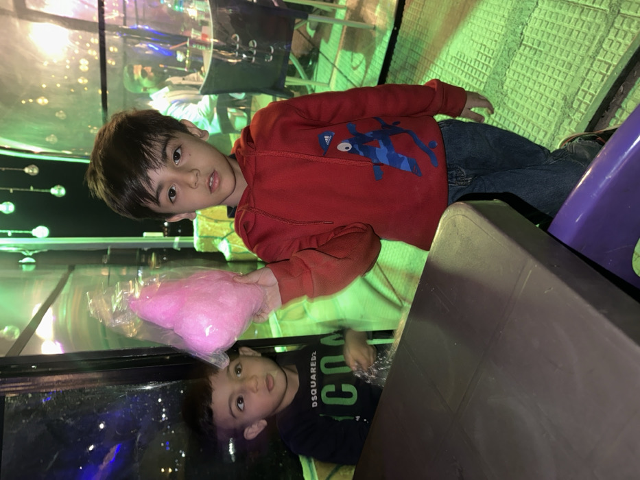 Two young boys are featured. The top boy wears a red hoodie with a blue design and jeans. He holds pink cotton candy. The other boy, seemingly reflected in a surface below, wears a dark blue shirt with “DSQUARED2” written across it. They appear to be inside a glassed-in area with lights and vegetation visible in the background. A purple chair and a brown table edge are visible in the foreground.