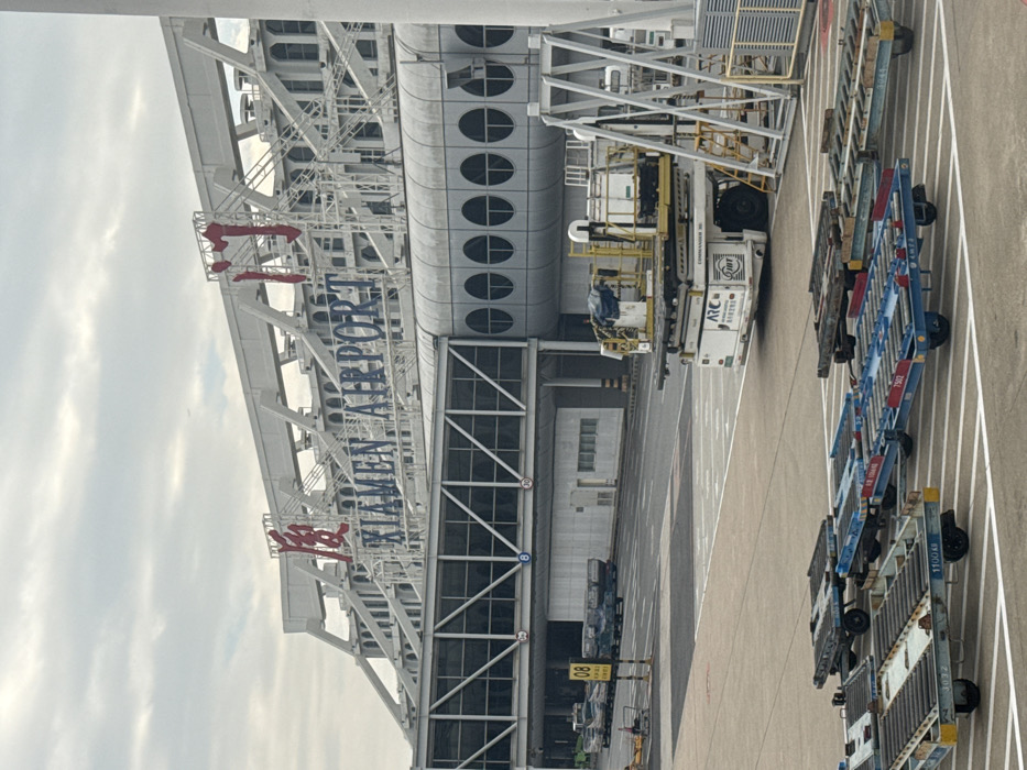 An airport terminal with a sign reading "XIAMEN AIRPORT" is visible