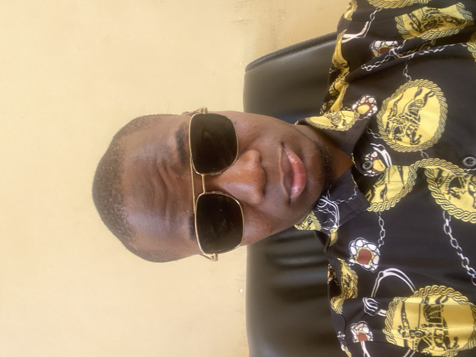 A single male individual is depicted in an indoor setting, likely in the city of Unknown, Nigeria. The individual is positioned centrally, facing directly towards the camera, and appears to be seated in a black office chair, the back of which is visible behind him. He has a dark complexion and short, dark hair. He is wearing aviator-style sunglasses with dark lenses and gold-colored frames, obscuring his eyes. His mouth is closed. He is dressed in a short-sleeved button-up shirt with a black base featuring a repeating pattern of gold chains, medallions, and other decorative elements, some with red and white accents. The background consists of a plain, light yellow-beige wall. No other individuals or significant objects are visible in the scene.