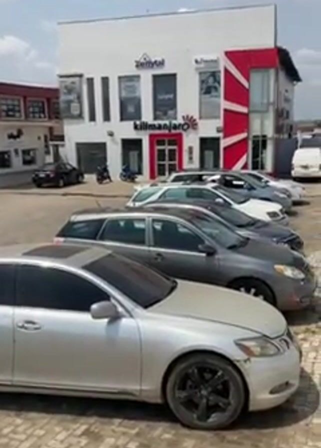 parking lot of a commercial building complex on a bright day. The building facade features the names of businesses, including "Zenitytal" and "Kilimanjaro." Several cars of various makes and models are parked in the lot. There are gray, silver, and white cars visible, along with a black car near a small white building with a kiosk. The parking area appears to be paved with patterned bricks. The sky is blue with scattered white clouds. In the background, additional buildings are visible, one painted pink and another gray, typical of an urban area. The camera angle is low, starting with a close-up of a silver Lexus sedan and panning slightly to show more of the parking lot and the buildings. The video ends showing another car in the lot.