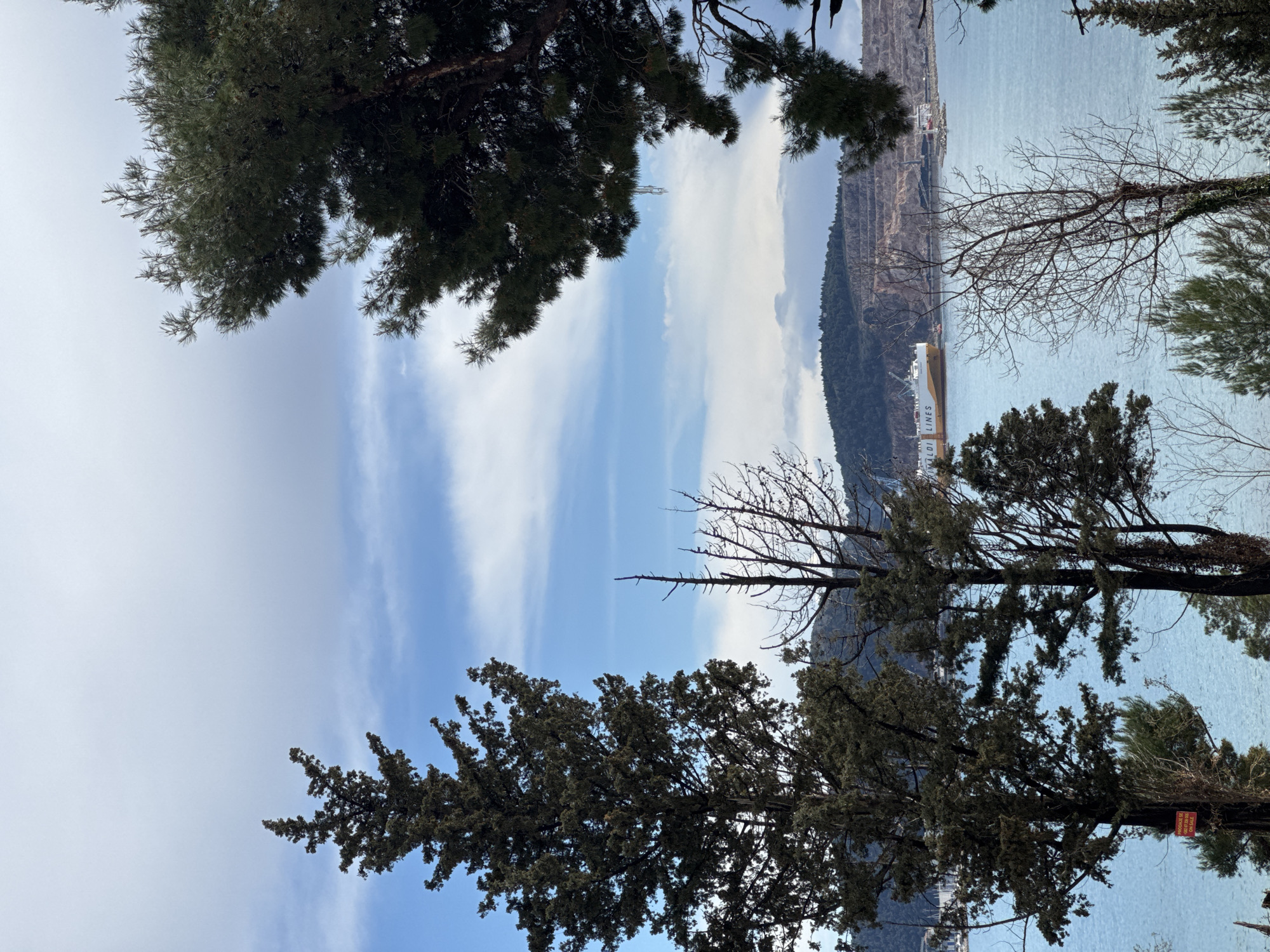 The image presents an elevated view of a coastal scene in Bar, Montenegro, under a partially cloudy sky. The foreground is framed by multiple trees; a prominent tall, dark evergreen tree stands on the left, with a smaller bare deciduous tree to its right. A red rectangular sign, partially obscured, is affixed to the lower trunk of the prominent evergreen on the left, displaying text including "PRODAJE SE" and "FOR SALE". Another bare deciduous tree, partially covered in ivy, is visible in the lower central-right. The midground features a wide expanse of calm, light blue-green water, identified as a bay or harbor. A large yellow and white vessel, bearing the "GRIMALDI LINES" logo on its hull, is positioned on the water, appearing to be docked or anchored. To the right of this vessel, a smaller red and white ship is partially visible. Further right, a white structure resembling a beacon or lighthouse marks the end of a breakwater. Cranes and industrial port infrastructure are discernible along the distant shoreline. The background consists of hills and mountains. The left portion of the background shows hills densely covered with dark green foliage, indicative of forests. To the right of these forested hills, a distinct terraced excavation or quarry site is visible on a hillside. No individuals or animals are present in the scene.