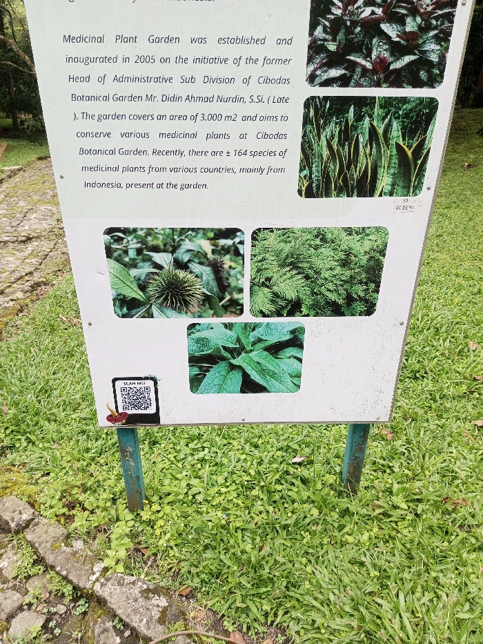 The scene depicts an outdoor setting featuring a white information sign positioned vertically on two dark green metal posts, surrounded by green grass. The sign provides details about a Medicinal Plant Garden, established and inaugurated in 2005 at the Cibodas Botanical Garden, Indonesia, under the initiative of Mr. Didin Ahmad Nurdin. The garden covers 3,000 m² and conserves approximately 164 species of medicinal plants from various countries, predominantly Indonesia. The user's specified location of Kanand, India, contradicts the explicit text on the sign, which states "Cibodas Botanical Garden" and "Indonesia." The sign features five distinct photographic inserts: a partially visible image of dark foliage at the top right, a vertical close-up of green and yellow striped snake plant leaves on the middle right, a spiky green spherical object on a leafy plant on the bottom left, a dense mass of finely textured green foliage in the middle bottom, and large, textured green leaves occupying the lower right insert. A black QR code labeled "SCAN ME!" is present in the bottom-left corner of the sign, below which a small, dark red, elongated object rests on the sign's surface. The immediate ground cover consists of green grass and low-lying vegetation. To the left of the sign, a section of an irregular stone path, composed of grey, moss-covered stones, is visible. The background shows blurred green foliage, indicative of trees or shrubs. No people or overt actions are present in the frame.
