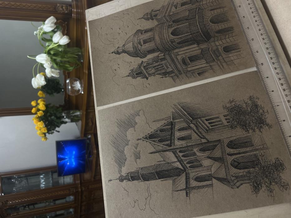 The image depicts an indoor scene in the city of Vagharshapat, Armenia. In the foreground, two pen-and-ink architectural sketches are displayed side-by-side on light brown paper. A clear plastic ruler, marked in centimeters, rests horizontally across the bottom edge of the paper. The left sketch illustrates a Gothic-style cathedral or church with a tall spire, pointed arches, and hatched shading for clouds and building texture. The right sketch features a Baroque or Neoclassical building, possibly a church, characterized by a prominent dome, a clock tower, arched windows, balconies, and small birds drawn in the sky. The background shows a softly lit interior. A dark wooden console table with ornate carvings is positioned behind the sketches. On the table, a clear glass vase holds a bouquet of vibrant yellow flowers to the left, and another glass vase contains white drooping tulips to the right. A smaller, clear glass decorative object is visible between the two flower arrangements. Above the console table, a large mirror with a wooden frame reflects a plain light-colored wall. To the left of the console table, a tall, dark wooden display cabinet with glass doors showcases various pieces of glassware. A small, dark flat-screen television displaying a bright blue, abstract image is situated on a stand in front of the display cabinet. No individuals are present in the scene.