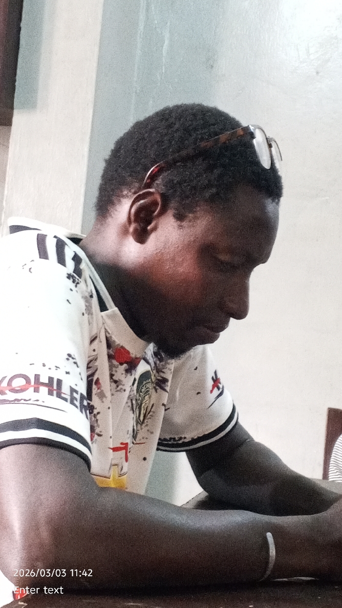 An adult male with dark complexion and short, dark, curly hair is depicted in a profile view, facing right, with his head tilted downward. He wears a white short-sleeved t-shirt featuring black and white striped cuffs on the sleeves, the word "KOHLER" on the left shoulder/chest area, and other abstract patterns. Eyeglasses with tortoiseshell frames are perched on top of his head. A silver-colored bangle or bracelet is present on his right wrist. His forearms rest on a dark brown, possibly wooden, surface. The background consists of a plain, light-colored wall with minor textural variations. A dark brown object, potentially furniture, is partially visible on the far right. The image bears a digital timestamp "2026/03/03 11:42" and "Enter text" in the lower left corner. The scene is located in Dakata, Nigeria.