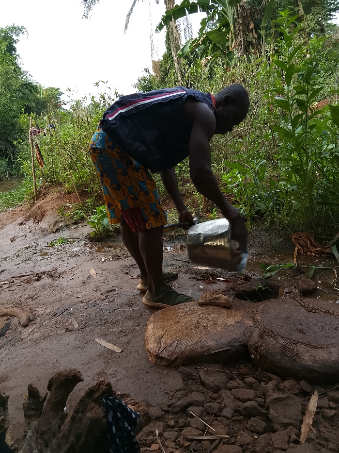 A man wearing a dark tank top and colorful patterned shorts stands near a water source. He is using a metallic container to scoop or pour water, possibly from a small pool or hole in the ground. The surrounding area is muddy, with rocks and vegetation present. The scene takes place outdoors, likely in a rural or natural setting.