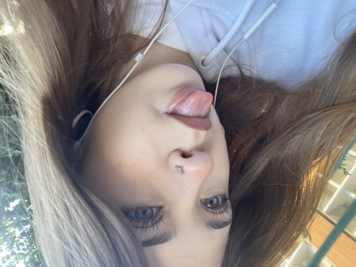 - "A young woman with long brown hair, blue eyes, and a nose piercing is sticking her tongue out" by FM-VN4T93, licensed under CC BY 4.0