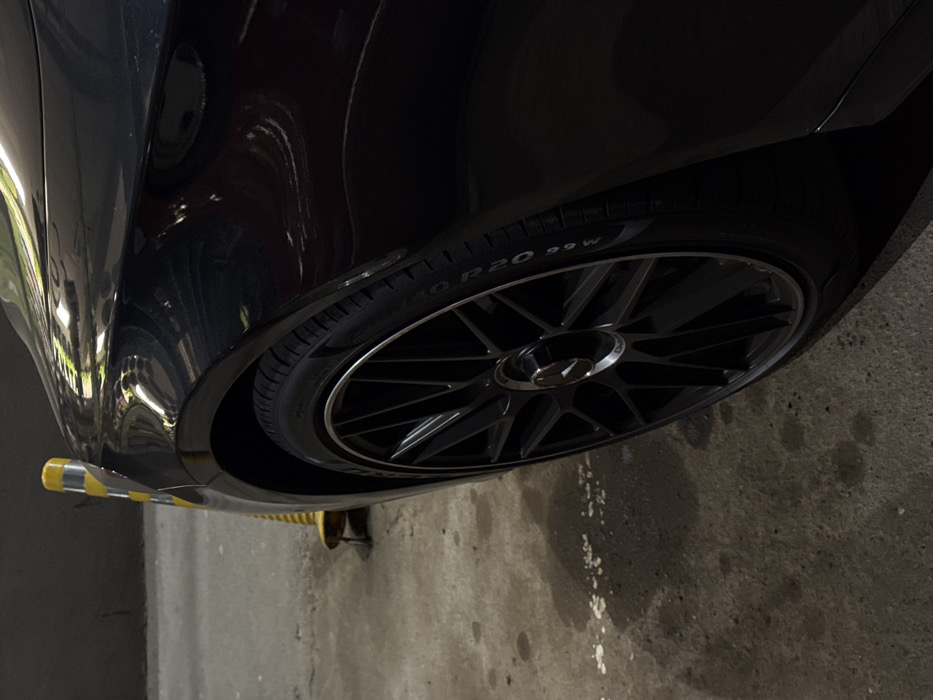 The image displays the front passenger side of a black, highly reflective Mercedes-Benz AMG vehicle, stationary in an indoor parking facility or service bay in Dobrich, Bulgaria. The vehicle's black multi-spoke alloy wheel features a silver outer rim and a center cap with the Mercedes-Benz and AMG logos. The tire, marked with white lettering partially reading "FORZO R20 99W," shows evidence of use. A yellow and black striped safety cone or bollard is positioned on the concrete floor in front of the car's fender. The concrete floor is dark gray, marked with stains, wet patches, and irregular white lines. The background consists of a plain, dark gray wall. Overhead lighting produces strong, elongated reflections across the car's polished body panels. No individuals are present in the scene, and no active interactions are depicted.