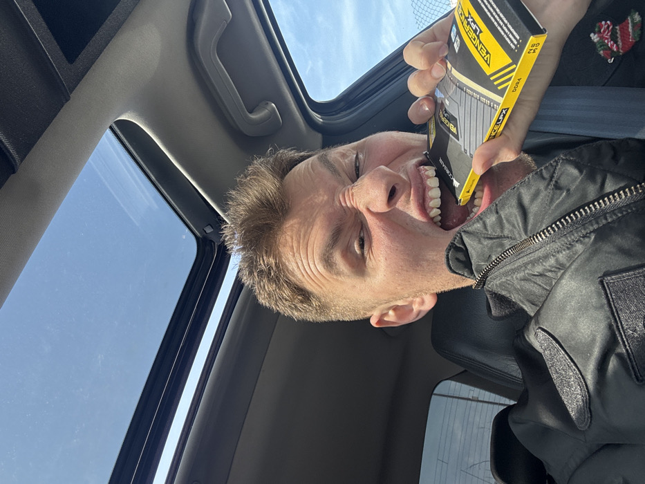 This image depicts a male individual inside a vehicle, located in Unknown, Bulgaria. The subject, a male with short brown hair and fair skin, is positioned in what appears to be the passenger seat. He is wearing a dark, zippered jacket with a patch on the left arm. His head is turned slightly to the right, and he is looking directly at the camera with an exaggerated facial expression, characterized by a scrunched nose, furrowed brow, and widely opened mouth revealing his teeth. He is holding a yellow and black rectangular box, labeled "CORSAIR VENGEANCE LPX DDR4," to his open mouth as if biting it. His right hand is visible, gripping the box. The vehicle's interior shows a black headliner, a sunroof through which a clear blue sky is visible, and a grab handle above the passenger door. A seatbelt is visible across the subject's chest.
