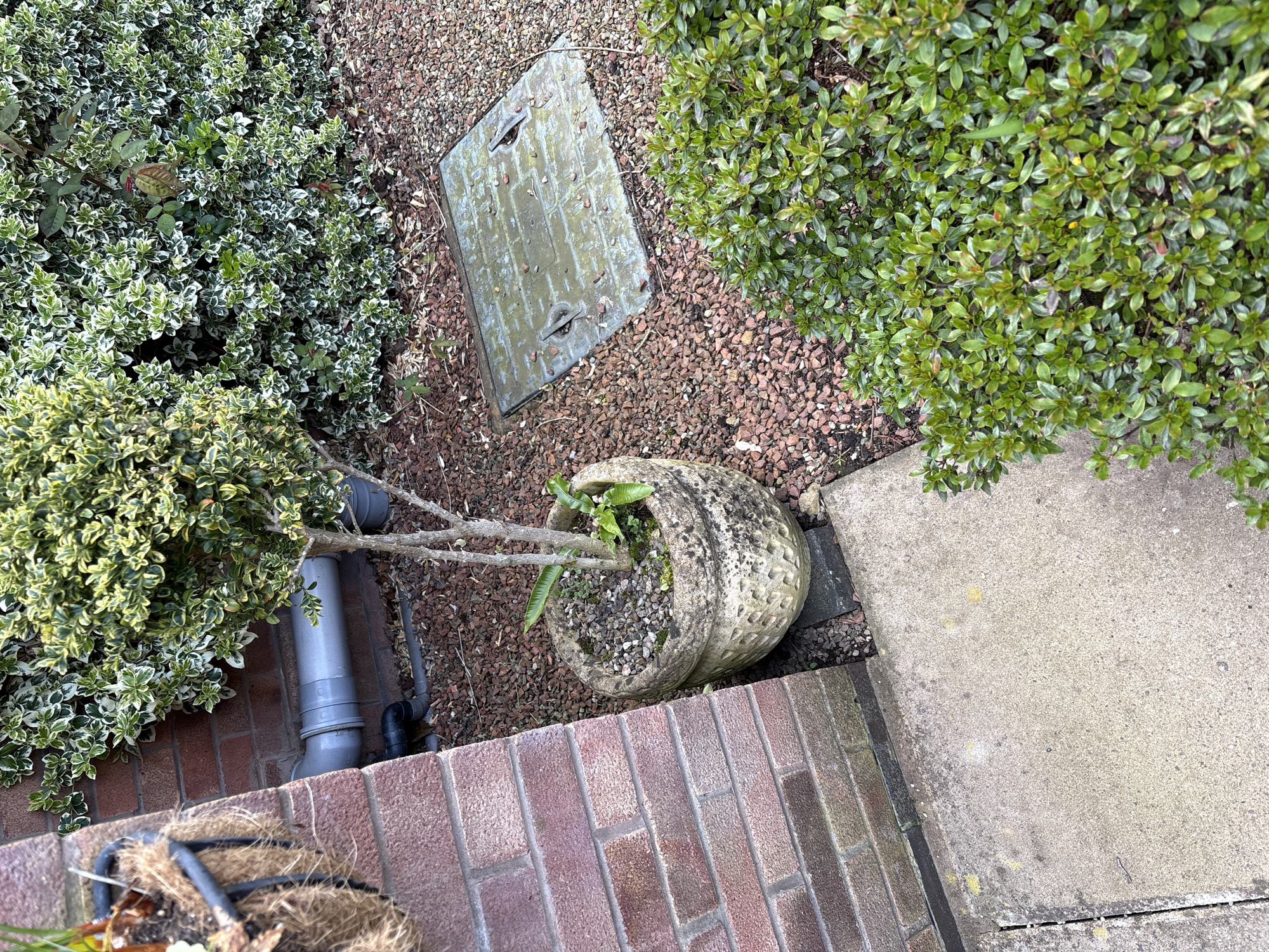 n outdoor scene in Longden, United Kingdom. A rectangular metal access cover rests on gravel between patches of green bushes. A cracked, round planter sits on its side, spilling gravel onto the brick and concrete paving nearby. A gray drainage pipe runs along the brick wall.