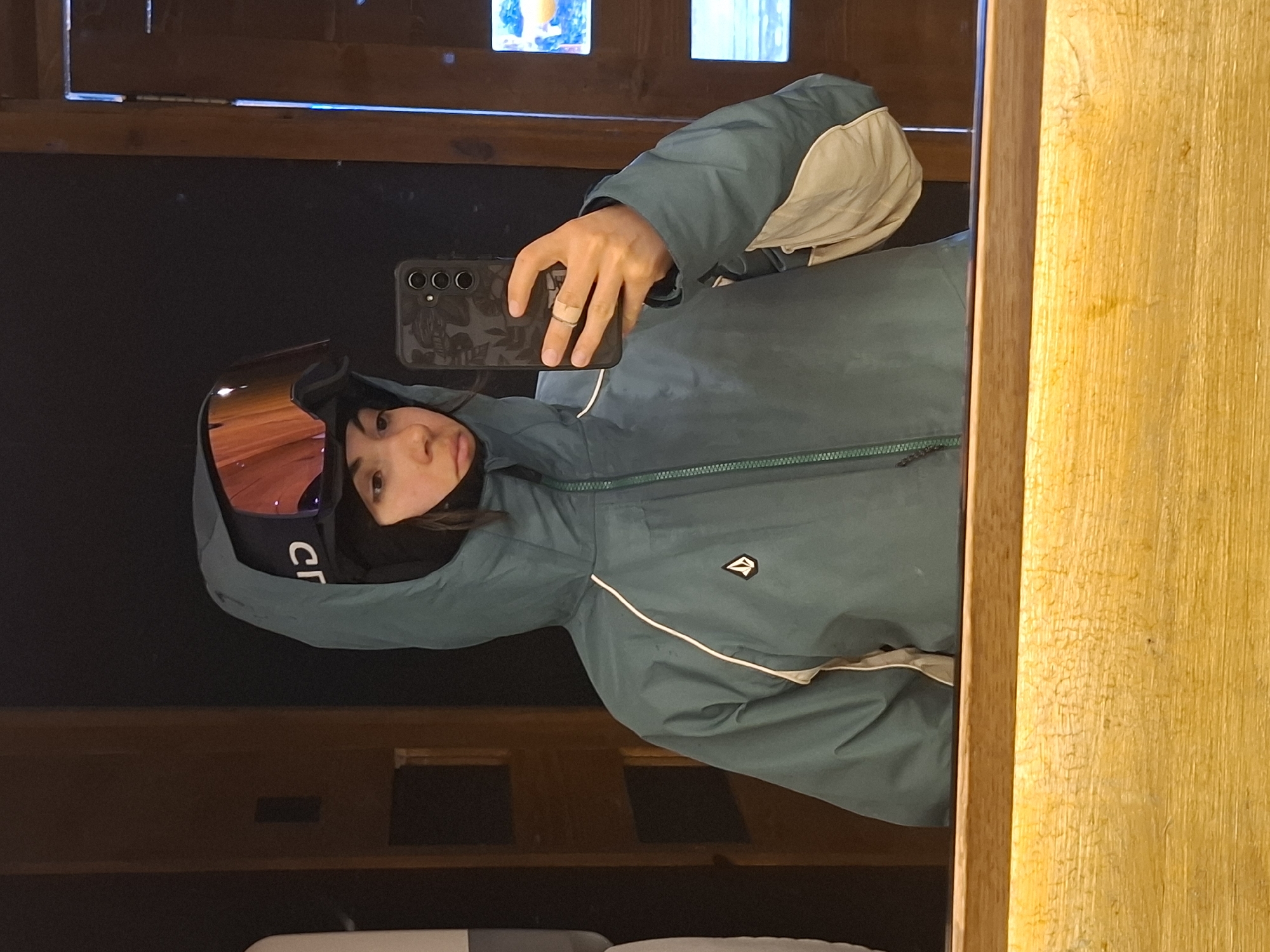 A person wearing ski goggles and a winter jacket is taking a selfie in front of a mirror. The person is inside a building. The location is Bansko, Bulgaria. The phone has a patterned case. A ring is on the person's finger. The mirror is surrounded by a wooden frame. The wooden background with windows is visible behind the person.