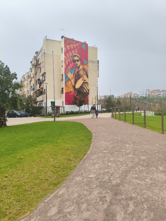 A tan apartment building boasts a large mural of a man playing a drum on its side. Adjacent to the building is a grassy park with a walking path. A person and child walk along the path towards the right. The sky is overcast. Further in the distance, several houses sit on a hill. Wooden posts line the right side of the path. Cars are parked near the building.