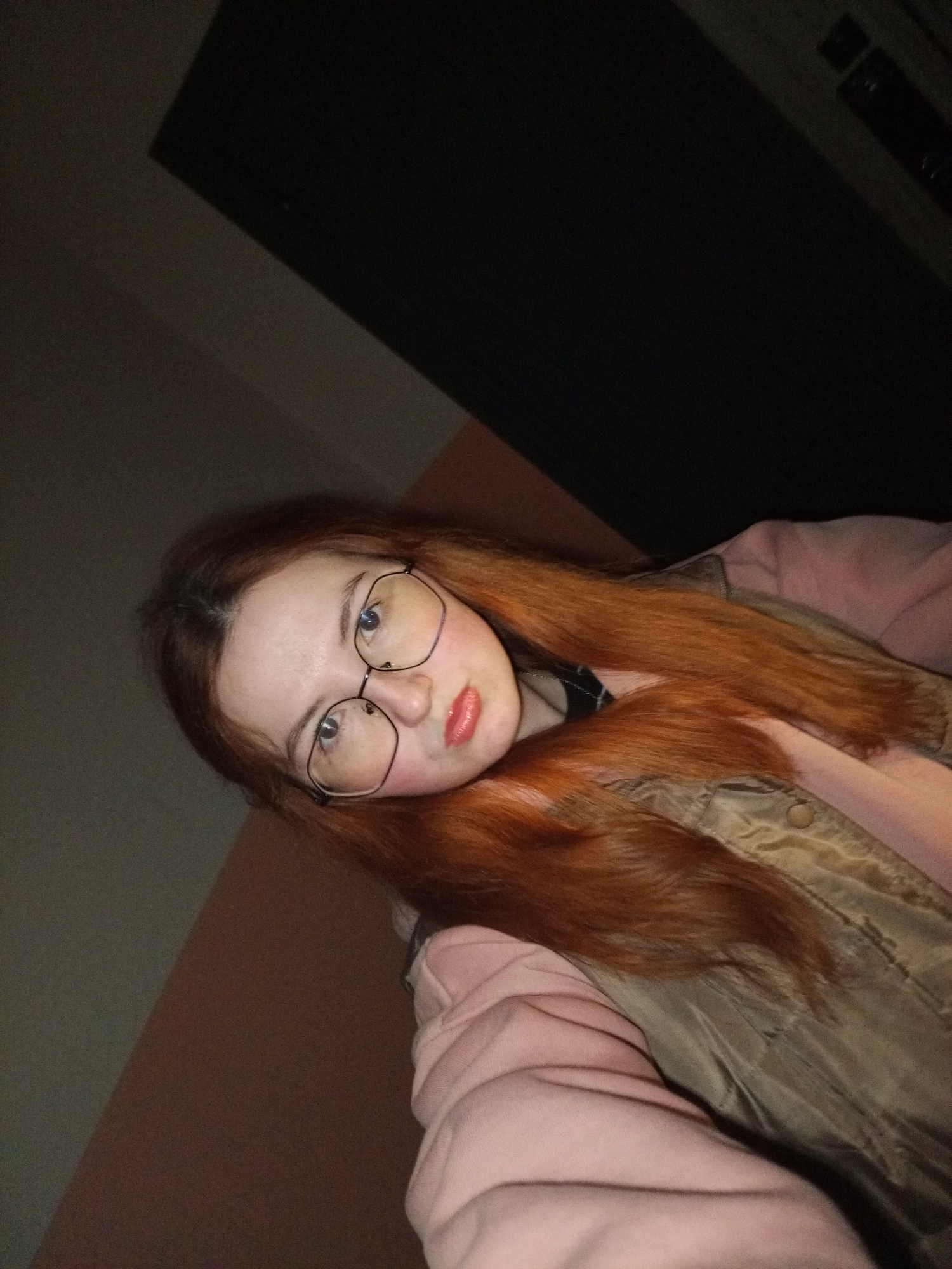A diagonally framed close-up photograph depicts a young female indoors in Chaikovsky, Russia. She has long, reddish-brown hair, wears round-framed eyeglasses, and her lips are coated with a glossy, light red or coral substance. She is dressed in a light pink top, possibly a hooded sweatshirt, layered beneath a khaki or olive-green vest or jacket. A black and white checkered pattern is visible near her neck, suggesting an additional garment or accessory. She maintains direct eye contact with the camera, exhibiting a neutral facial expression. The background consists of a light brown wall to the left and a darker, presumably black, door or panel to the upper right, indicative of a dimly lit interior setting.