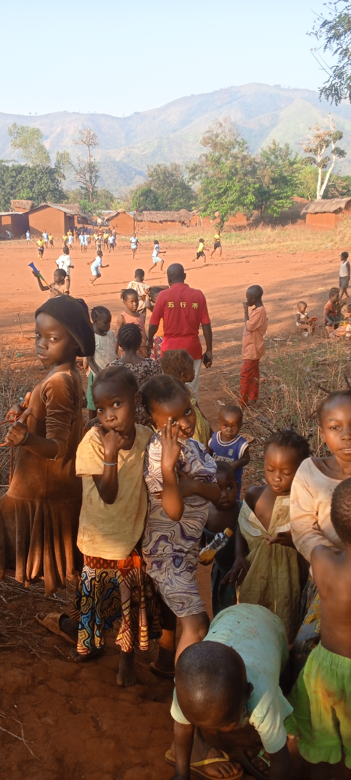 The image depicts an outdoor communal scene in Konongo, Democratic Republic of the Congo, under clear daylight conditions. In the immediate foreground, a group of approximately ten children, ranging from toddlers to pre-adolescents, are gathered. A young girl on the far left, dressed in a brown long-sleeved garment, faces the camera with a neutral expression, her right arm slightly raised. Centrally, another young girl in a yellow t-shirt and a patterned skirt looks towards the camera, her right hand near her mouth, displaying a light blue bracelet on her left wrist. Adjacent to her, a third young girl in a purple and white patterned dress also faces the camera, her right hand partially obscuring her face, while holding a small plastic bottle with an orange liquid in her left hand. To the lower right, a child in a light green shirt is bent over, wearing yellow flip-flops. A man wearing a red short-sleeved polo shirt with the Chinese characters "五行市" ("Wuxing City" or "Five Elements City") on the back stands with his back to the camera, facing other children. He holds a dark rectangular object in his left hand. A child to the left of the man holds a multi-colored toy, possibly a horn or rattle. The mid-ground features a broad, unpaved expanse of reddish-brown earth, serving as a playing field. Approximately 15-20 children are actively engaged in a game of football, depicted in various running and interacting postures. Several single-story buildings, constructed from reddish-brown material with thatched or possibly sheet metal roofs, are visible behind the playing field. Scattered trees with varying foliage density are present, including a tall, light-barked tree centrally. To the right of the playing field, a slender individual in an orange shirt observes the scene, with other individuals seated or standing further back. The background is dominated by distant, hazy mountains extending across the horizon, beneath a clear, bright sky. The entire scene is illuminated by natural sunlight, casting visible shadows and highlighting the reddish tones of the earth and structures.