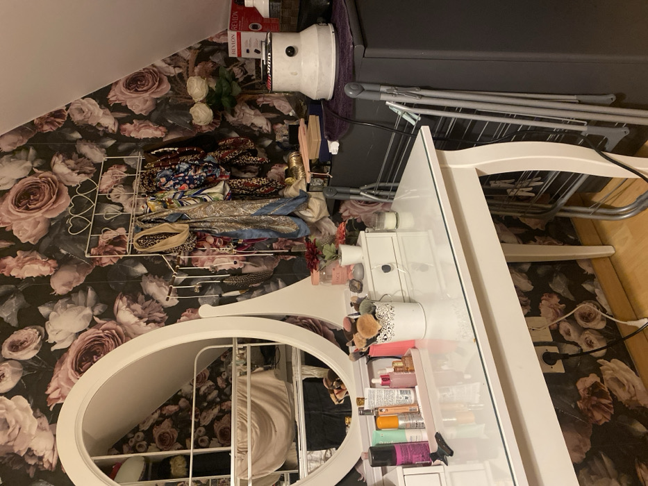 A vanity table, painted white, is set against a dark floral wallpaper. An oval mirror is attached to the table. Makeup and brushes are organized on the table. A wire rack holding headbands and scarves sits nearby. A clothes drying rack is positioned behind the vanity. A Revlon hair dryer and a white humidifier are placed on top of a gray dresser.