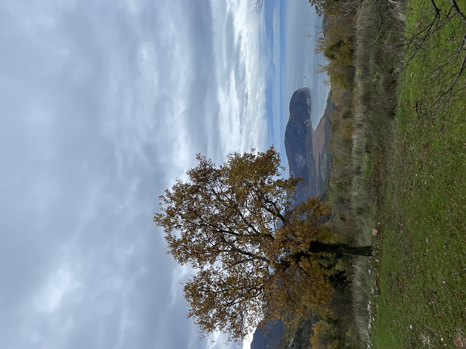 The image depicts an elevated panoramic landscape view from Novoselje, Montenegro, under an overcast sky. The upper approximately two-thirds of the frame is dominated by a dense, gray cloudy sky with discernible cloud formations. In the immediate foreground, a patch of green grass is visible, transitioning into drier, sparse vegetation. Centered slightly to the left in the midground stands a mature deciduous tree with full, densely packed yellow-brown autumn foliage, indicating a seasonal change. Its trunk is dark, with some visible growth, possibly ivy, at its base. Beyond the foreground and the prominent tree, the terrain slopes downwards into a valley or plain, characterized by mixed green and brown vegetation, consistent with a coastal environment. In the background, a long, curving sandy beach stretches along the coastline of the Adriatic Sea. The sea itself appears calm, with a grayish-blue hue reflecting the cloudy sky. To the right, a significant dark green mountainous headland or peninsula extends into the sea, forming a distinct bay with the aforementioned beach. No individuals, animals, or artificial structures are discernibly present within the scene.