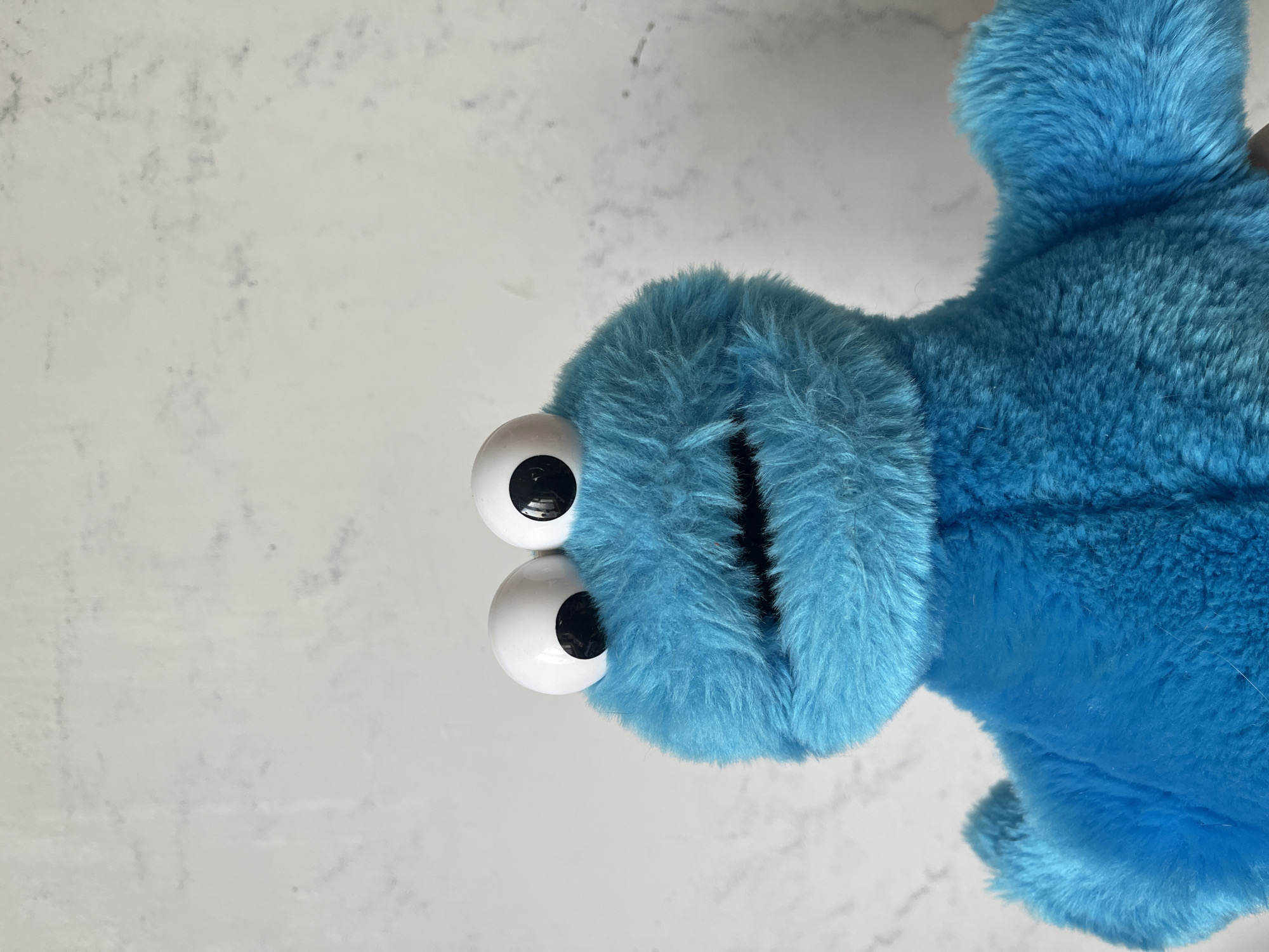 A plush toy resembling the character "Cookie Monster" from Sesame Street is depicted, facing forward and slightly upward, occupying the lower two-thirds of the frame