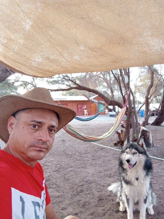 A man wearing a cowboy hat and a red shirt with white design poses next to a husky dog. They are outdoors, under a sunshade, on a dusty ground. In the background, there's a wooden cabin, trees, and hammocks hanging between the trees. The scene is casual and relaxed.