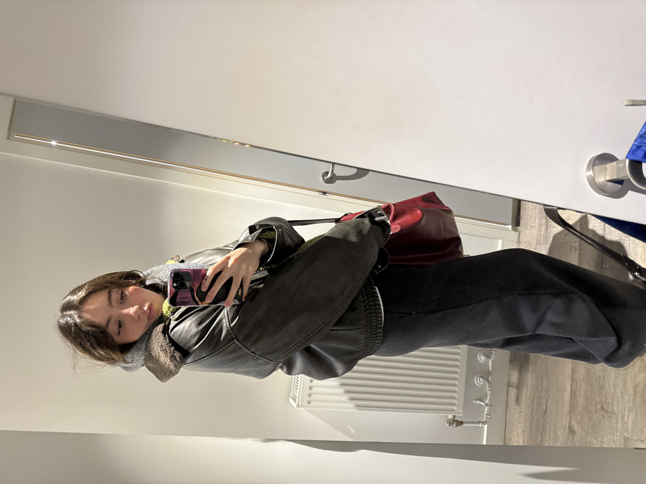 An indoor photograph shows a young adult female reflected in a mirror. She stands in a slight three-quarter profile, facing left, with her head turned towards the camera held in her right hand. Her dark hair is casually styled. She wears a dark, possibly olive green, leather bomber jacket featuring a brown fur collar, layered over a grey hooded garment with a visible bright green element at the neck. Dark grey, wide-leg trousers complete her attire. A dark red shoulder bag is slung over her left shoulder. The background reveals a light brown wooden floor and an off-white wall. A white vertical panel radiator with white piping is visible on the lower left. A white interior door with a silver-colored lever handle is partially visible on the right, with a blue bag hanging from a lower hook on the door. The precise location within Hull, United Kingdom, is an unidentified interior space.