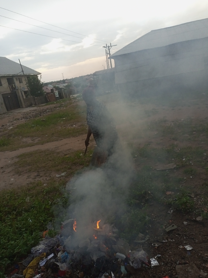 The image depicts an outdoor scene in Zango-ndaji, Nigeria, featuring an individual beside a burning refuse pile in what appears to be an unpaved residential area