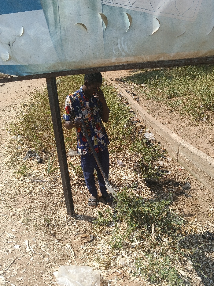 An outdoor scene in Doma, Nigeria, is captured under bright daylight. A male subject, standing slightly left of center, is positioned beneath a large, light-colored overhead panel with several crescent-shaped cutouts along its bottom edge. This panel is supported by a dark, vertical metal post on the left. The man wears a short-sleeved, collared shirt featuring a vibrant multi-colored pattern, dark blue trousers, and open-toed sandals. He holds a long-handled tool, possibly a hoe or shovel, with its blade resting on a patch of green foliage on the ground. His right hand is raised to his face, near his mouth and nose area. The ground consists of dry, light-brown dirt with scattered patches of green and dry vegetation. A concrete curb or low barrier runs horizontally across the mid-ground. Debris, including a clear plastic bag, is visible on the ground near the man and the curb. Strong shadows are cast from the man and the overhead structure, indicating direct sunlight.
