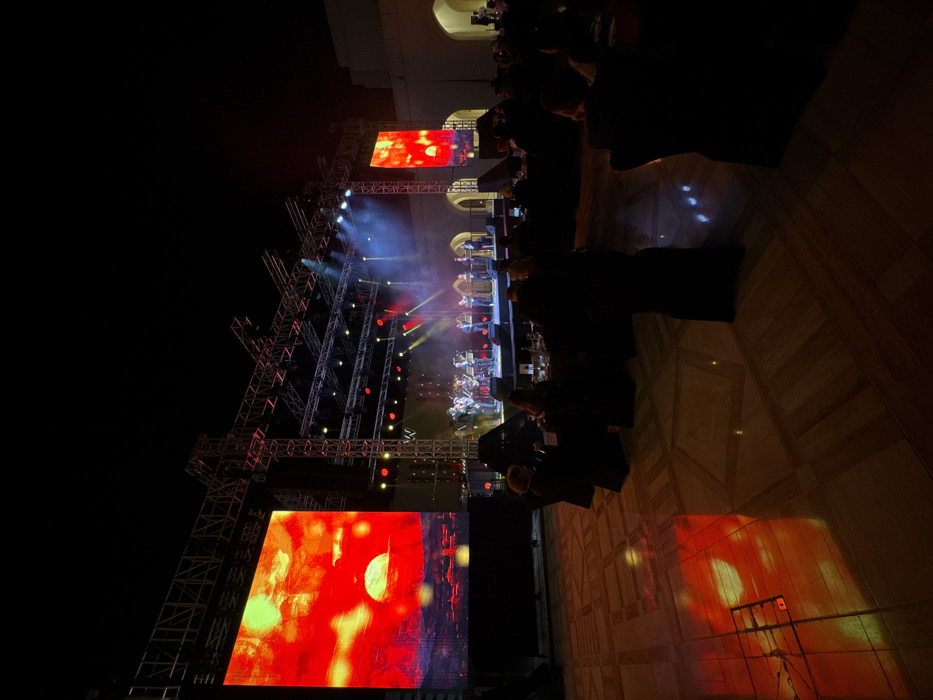 A nighttime concert scene features a stage with lighting rigs and large screens displaying abstract red images