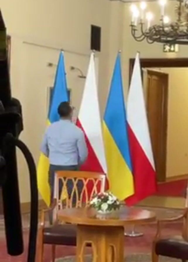 A man stands in a room, adjusting flags. There are two Ukrainian flags and two Polish flags in the background. A small round table sits in the foreground. The walls are beige, and a chandelier hangs from the ceiling. The man is wearing a light blue shirt and dark pants. A camera is visible in the lower left corner of the frame.