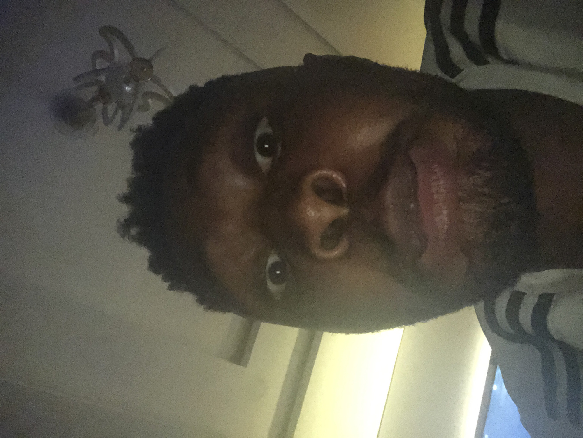 A low-angle photograph features a person with dark skin, likely male, cropped closely around the face, showing features such as the eyes, nose, lips, and beard. The person appears to have short, curly hair. The person is wearing a shirt with stripes on the shoulder. Above the person's head, a ceiling with a light fixture is visible. Behind the person, there appear to be blinds on a window. The location is unknown.