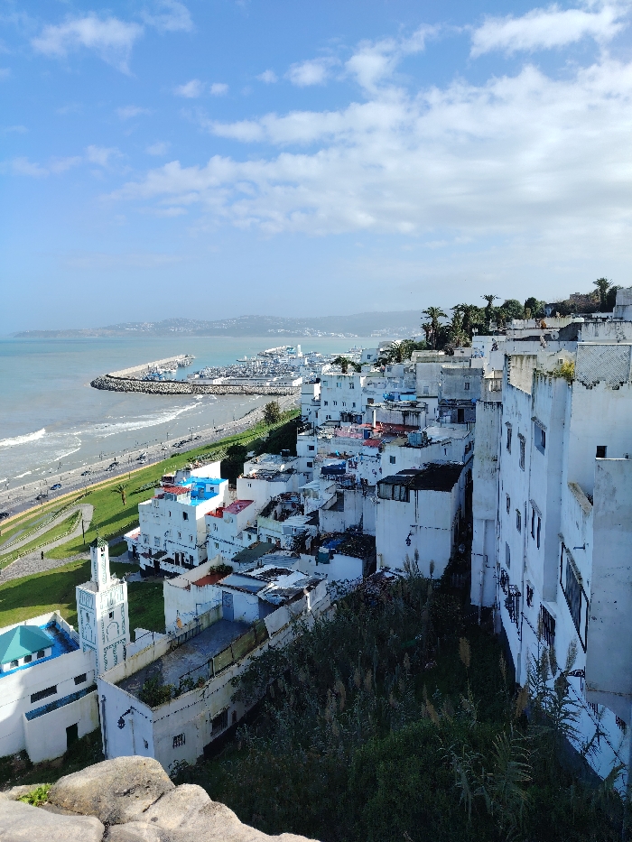 - "The image displays an elevated panoramic view of a section of Tangier, Morocco, overlooking the coastline and a dense urban area" by FM-10g0q2, licensed under CC BY 4.0