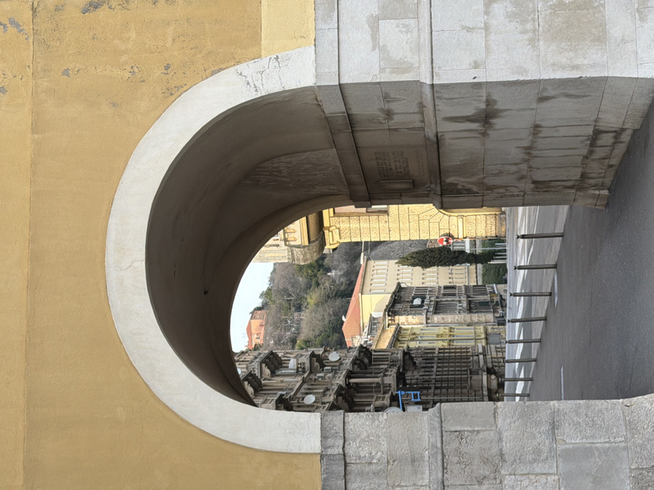 The image captures an urban street scene in Grad Rijeka, Croatia, viewed through a stone archway. The archway itself features a light-colored, block-stone base and a plastered upper structure painted in a yellowish-ochre tone, with a distinct white-grey inner arch. Weathering, including peeling paint on the exterior facade and dark water stains on the inner stone pillars, is evident. An inscribed stone plaque is visible on the inner right pillar of the archway. Beyond the arch, an asphalt road extends into the mid-ground. A row of silver bollards lines the left edge of the road, leading towards a visible white-striped crosswalk. No individuals or vehicles are present on the road. To the left, a series of multi-story buildings with intricate balconies and attached satellite dishes form a streetscape. To the right, a sunlit, light-yellow building with ornate architectural details is partially visible. A tall, slender, dark green tree stands near the right side of the road, adjacent to a circular red road sign. The background features a steep, tree-covered hillside with sparse foliage, suggesting late winter or early spring. An isolated building with an orange-tiled roof is situated near the summit of the hill. Additional buildings with red-tiled roofs are discernible lower on the hillside. The scene is illuminated by natural daylight, casting shadows and highlighting the texture of the archway and buildings.