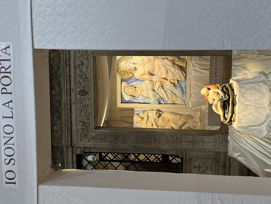 The image displays an indoor scene, likely an exhibition or display, viewed through a white architectural opening. At the top, a white banner with the red-brown capitalized text "IO SONO LA PORTA" (I am the door) is visible. Behind this opening, an ornate stone architrave features carved winged figures, foliage motifs, and the Latin inscription "EX PARIO TEXTVM MARMORE FVGEI OPVS" (This work shines from Parian marble). To the left, a dark, recessed window with a lattice pattern is visible. The central focus is a collection of sculptures, possibly terracotta, set against a light-colored backdrop and positioned within a historical architectural setting, identified as the Sanctuary of Santa Maria della Vita in Bologna, Italy. Three large figures are arranged in a background row on a platform draped with pleated light-colored fabric: 1. On the far left, a nude, light-toned male figure, slightly hunched, embraces a smaller, infant-like figure. 2. In the center, a solemn-faced female figure, draped in a light blue robe over a lighter undergarment, gazes downwards. 3. On the right, a bare-chested male figure with a golden halo around his head, wearing a light drape around his lower body, looks upwards. In the foreground, a smaller, polychrome sculpture of a reclining infant or putto is positioned on a square pedestal covered with ornate white damask fabric. The infant is nude, with rosy skin, resting on a dark green and reddish base. A single red rose is visible near its left hand. A partial white sign with the text "DI SPERANZA" (of hope) is visible behind this foreground sculpture. The scene is illuminated by directed lighting, highlighting the sculptures and architectural details.