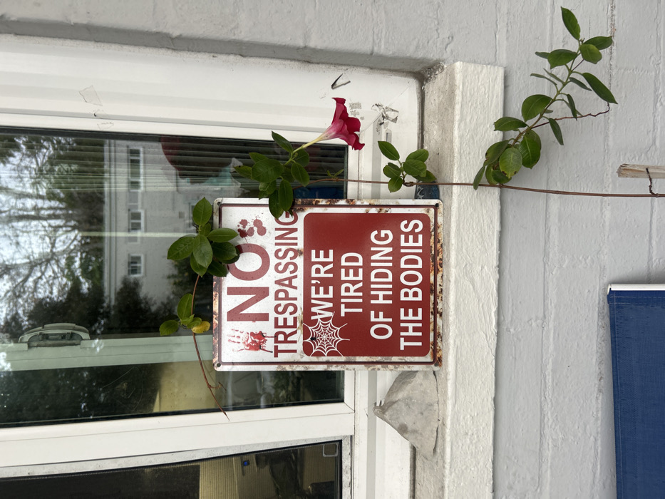 A "No Trespassing" sign with the phrase "We're Tired of Hiding the Bodies" in red lettering hangs on a window frame. Blood splatter imagery accompanies the warning. A vine with green leaves and a red flower grows around the sign and window. The window reflects a building and trees. The wall surrounding the window is painted white.