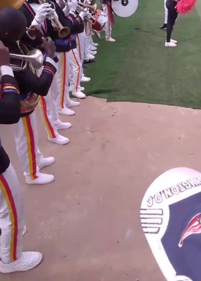 A low-angle shot captures a marching band assembled for an outdoor performance