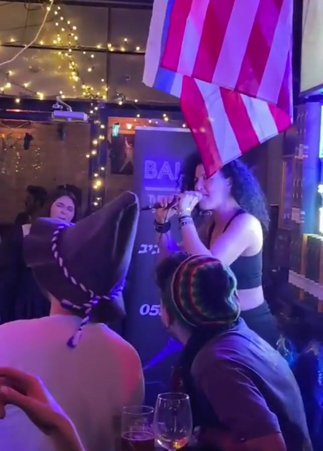 woman singing in a bar. The woman is wearing a black top and appears to be in the midst of a performance, holding a microphone and moving with energy. She has dark curly hair. In the foreground, a few people are visible, including someone wearing a large, pointy hat with braided details. A small American flag and an Israeli flag hang in the background. The bar area is decorated with string lights. Several glasses and bottles of beverages are sitting on the bar, suggesting it's a casual gathering or event. A sign in the background reads "Ballenby" and includes additional text in Hebrew. People are watching and enjoying the performance, and some are holding drinks. The overall ambiance is lively and festive.