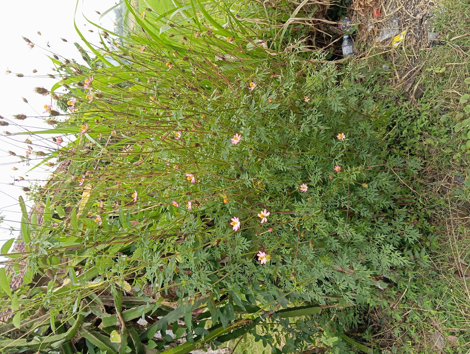 The image depicts an outdoor vegetated scene in Baron, Indonesia. A dense bush of *Cosmos caudatus* (Ulam Raja) occupies the central midground, characterized by its numerous slender green and reddish-brown stems, finely dissected green foliage, and multiple small flowers with pale pink petals and yellow centers. Interspersed are various flower buds and dried seed heads. To the left of the central bush, a large, segmented green plant, consistent with a dragon fruit cactus, is visible, partially obscuring a blurred background element featuring a reddish-brown tiled roof. To the right, tall, bright green foliage, possibly sugarcane or similar agricultural crop, rises behind the central plant. Beyond this, a flat, lighter green field, consistent with a rice paddy, extends to the horizon under an overcast sky. The foreground consists of sparse green and dried brown grass over soil. In the lower right corner, on the ground amidst dried vegetation, a clear plastic water bottle and a yellow plastic wrapper are visible. No human or animal subjects are present in the frame.