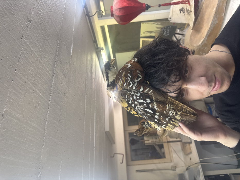 An indoor scene in Romainville, France, depicts a young adult male with dark, wavy hair and a black t-shirt, looking forward with a slight smirk. A taxidermied bird, possibly a pheasant, with speckled brown, white, and black plumage, rests on his head, facing towards the viewer's left. The man's right hand is raised to his temple, touching his hair near the bird's base. The environment appears to be a workshop or studio. The ceiling is white and textured. In the background to the left, a wooden-framed window, a workbench with various items including a white bucket, and a mounted animal head (possibly a deer) are visible. To the right background, a red hanging lantern with a tassel, a white fabric object with black calligraphy, and a large, light-colored wooden object resembling a boat hull or tray are present.