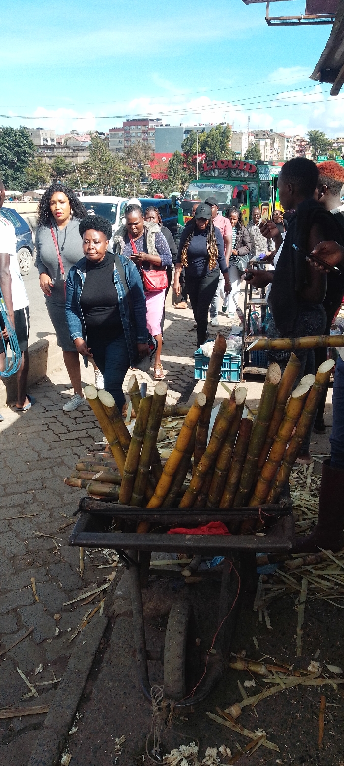 This image captures an outdoor urban street or market scene in Nairobi, Kenya, under a clear blue sky