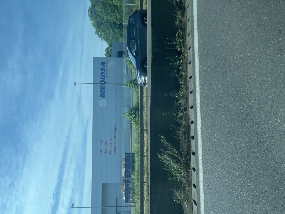 A blue car parked beside a grey building with "MEQUISA" printed on it. Below, there's "Chauffage, Sanitaire, Plomberie, Matériel electrique." The sky is blue with light clouds. Green trees are visible in the background. The foreground has a roadside with sparse greenery and a grey highway.